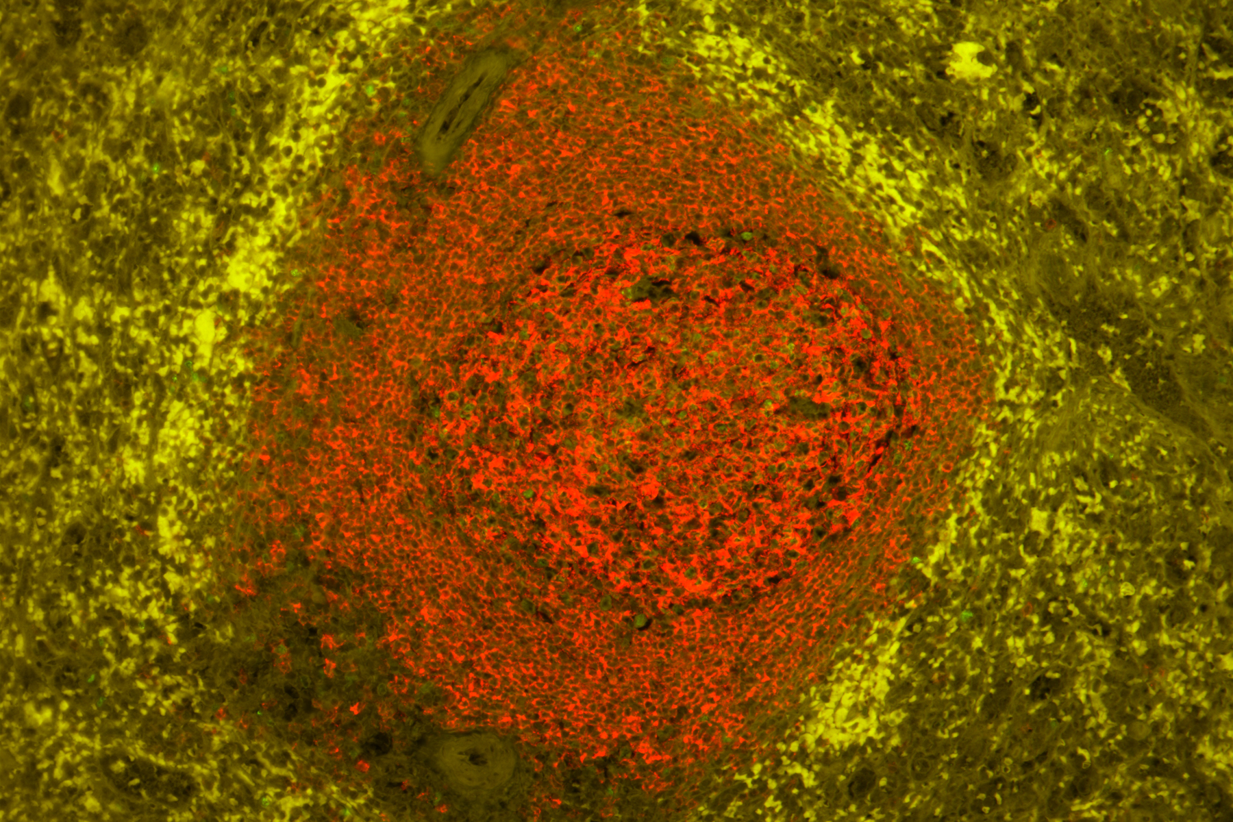 Dva snímky výše: Preparáty z lidské sleziny (FFPE) zabarvené k použití myších anti-CD20 (červená) a králičích anti-Ki67 (zelená) primárních protilátek detekovaných pomocí sady VectaFluor Duet kit (DK-8818). Povšimněte si významného potlačení autofluorescence na ošetřeném řezu (nahoře) při zachování dobře ohraničeného specifického signálu jak červeného, tak zeleného kanálu.
