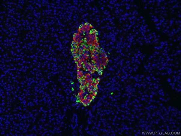 Obr. 3 Imunofluorescenční analýza buněk lidské slinivky břišní fixovaných 4% PFA s použitím protilátek proti glukagonu a inzulinu. Zelená: glukagon (15954-1-AP); červená: inzulin (66198-1-Ig)